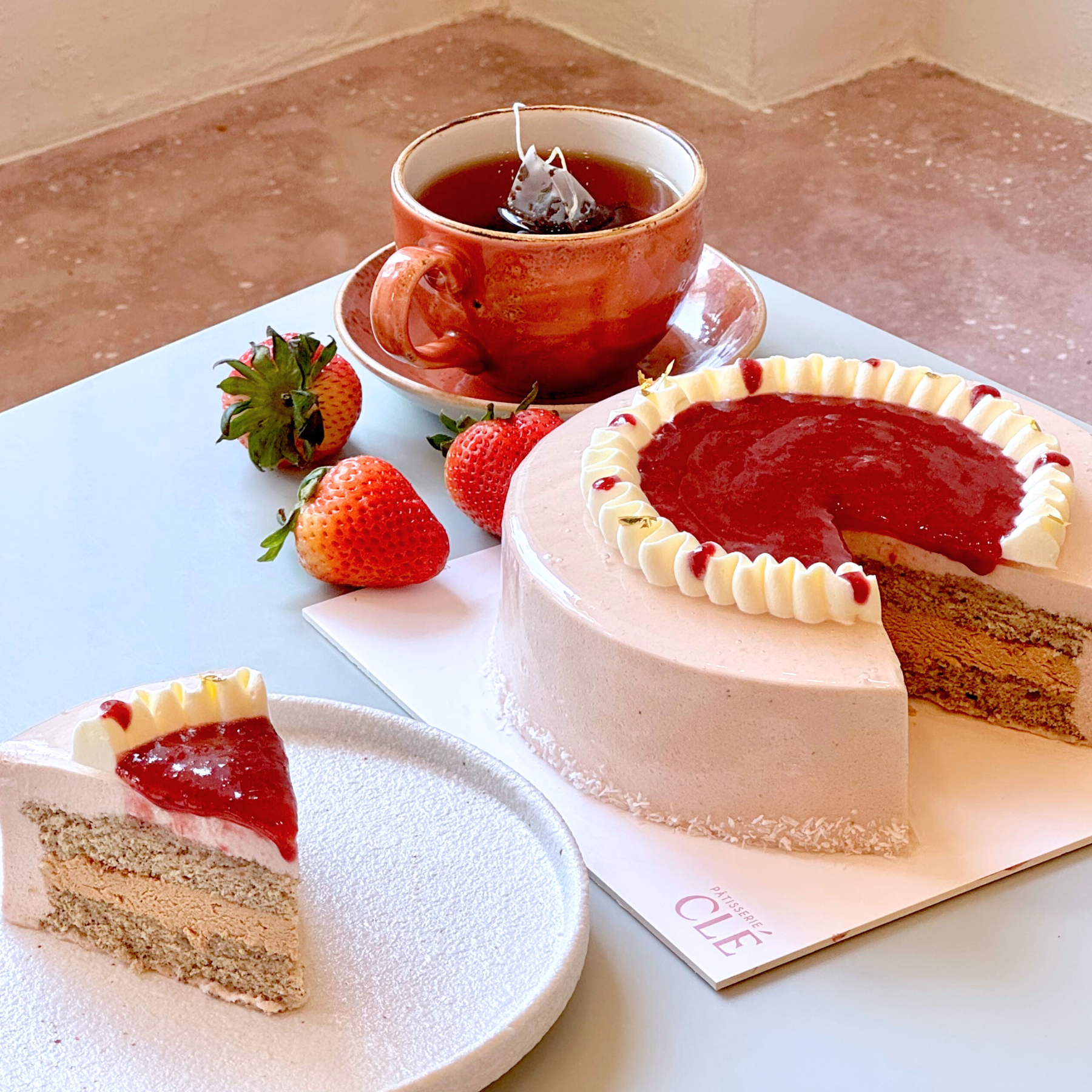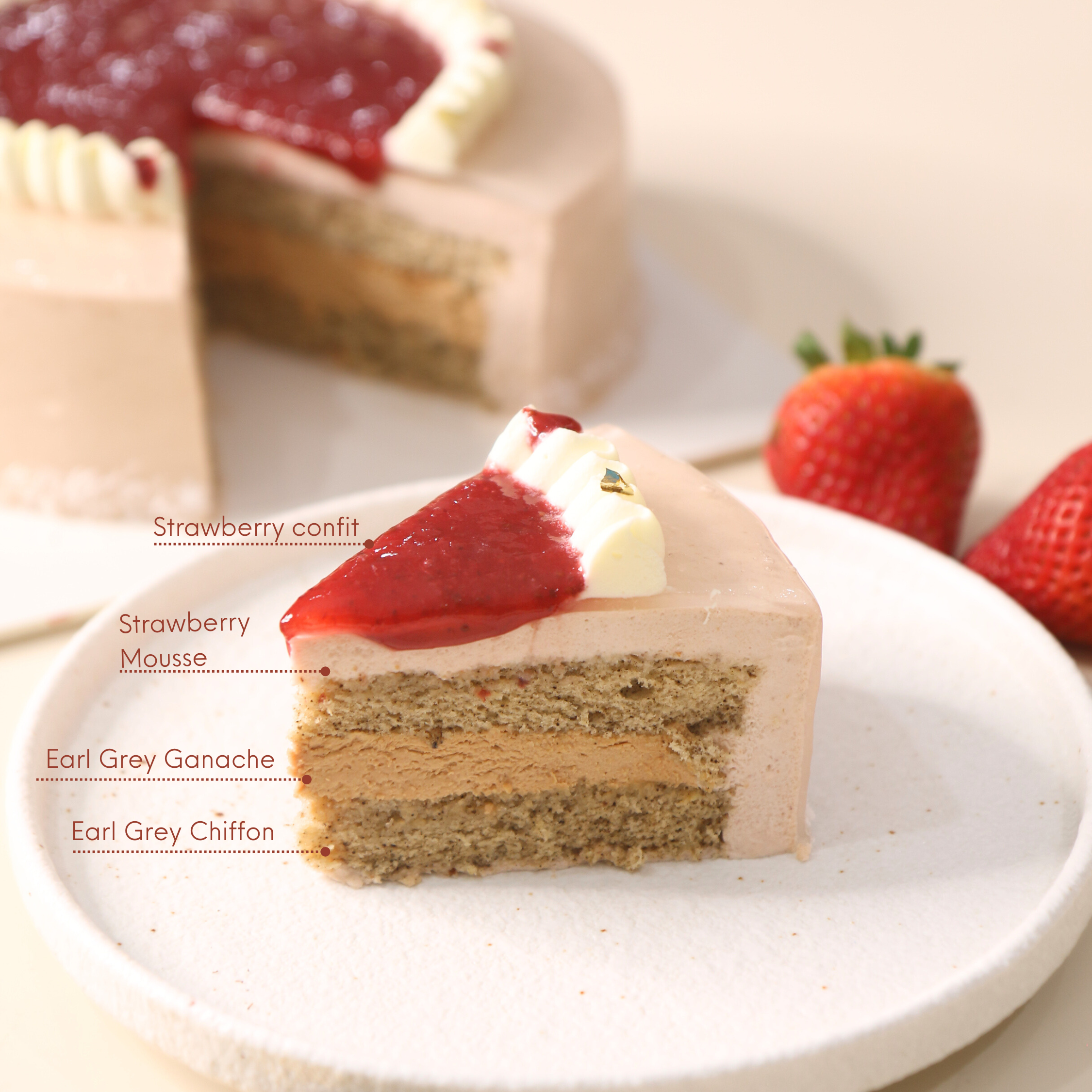 Our Earl Grey Strawberry Cake is a soft and refreshing dessert made with fluffy Earl Grey chiffon sponge, creamy Earl Grey-infused ganache, and a smooth strawberry mousse. The cake is topped with house made strawberry confit and whipped cream for a simple, clean finish.