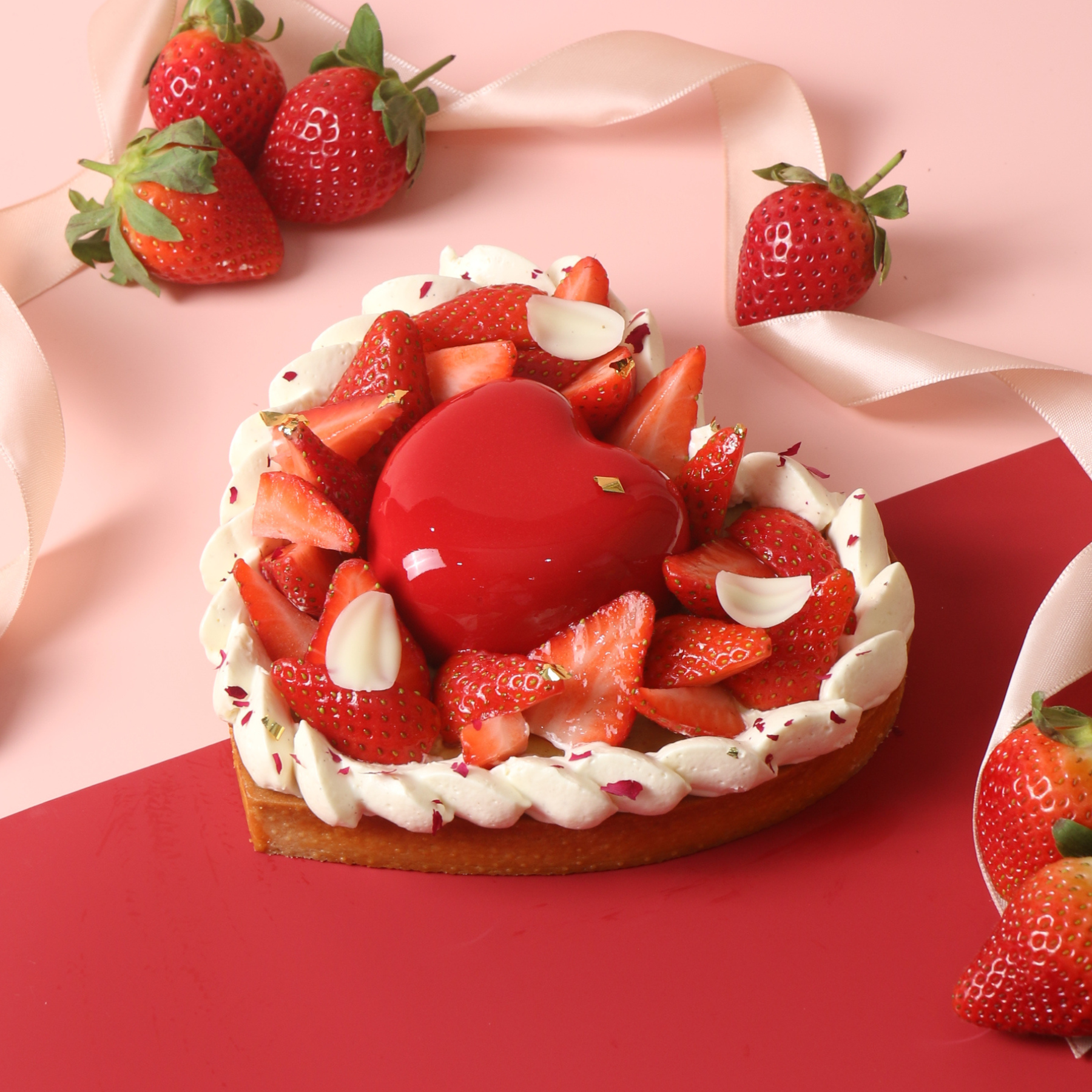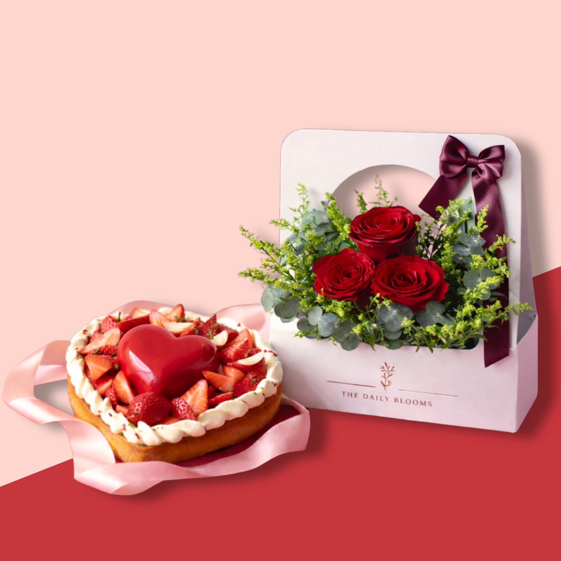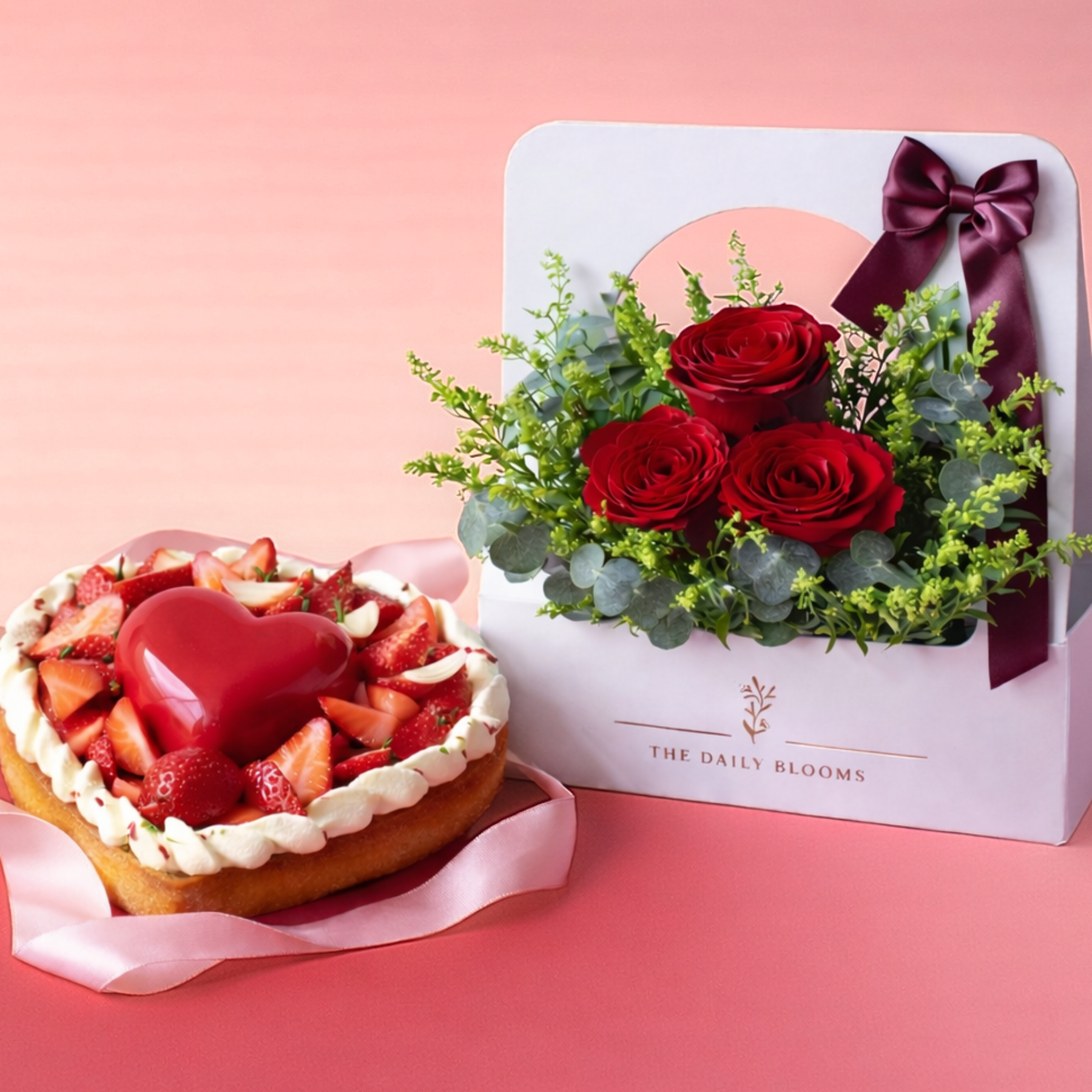This Valentine’s bundle brings together our My Valentine tart — a delicate buttery tart crust filled with smooth pistachio cream, adorned with fresh strawberries and finished with a glossy chocolate heart — alongside a Scarlet Red Roses Bloom Box.