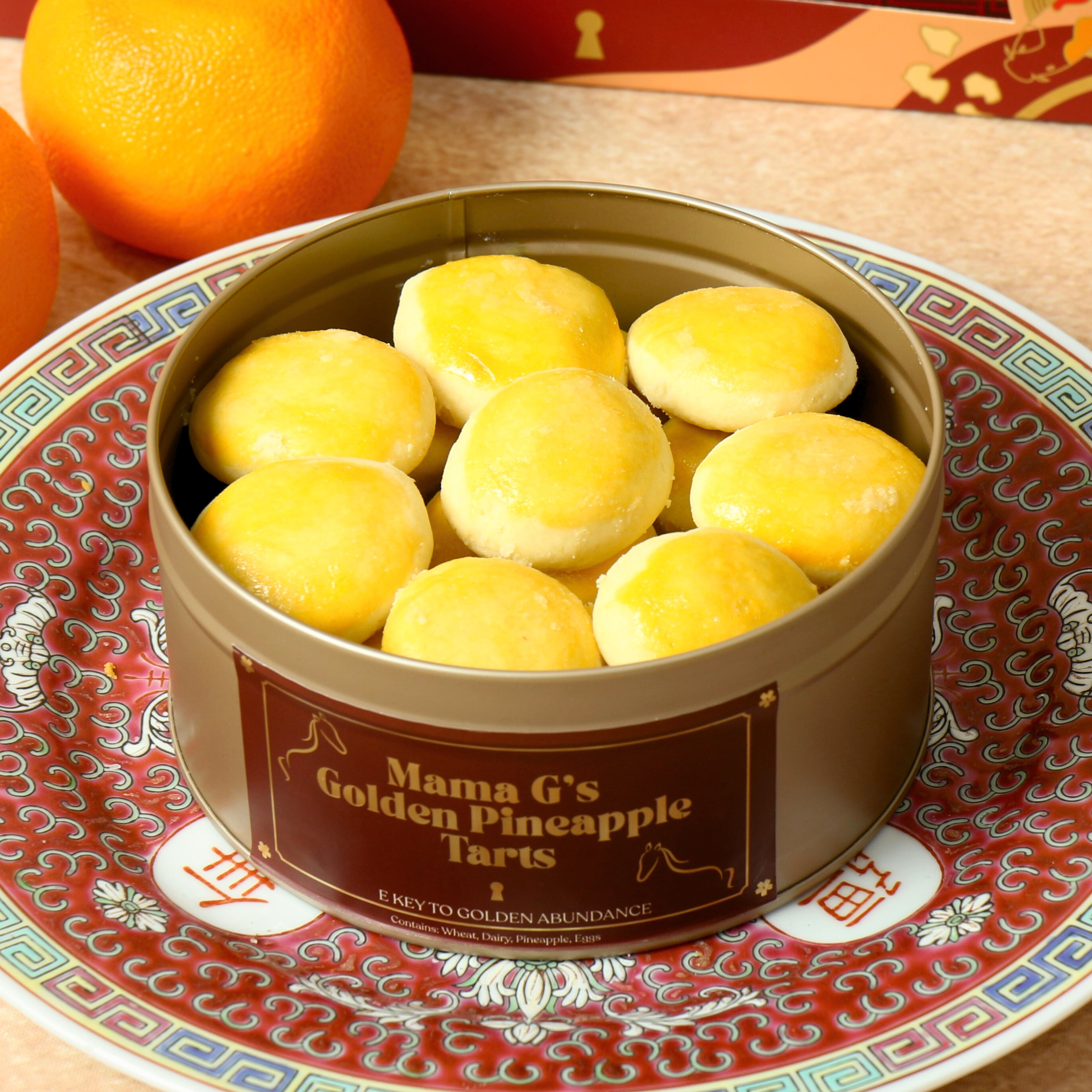 Crafted with care and tradition, Mama G’s Golden Pineapple Tarts are a celebration of patience, heritage, and flavour. Each tart begins with hand-peeled pineapples, slow-cooked in small batches until naturally caramelised into a rich, fragrant filling.